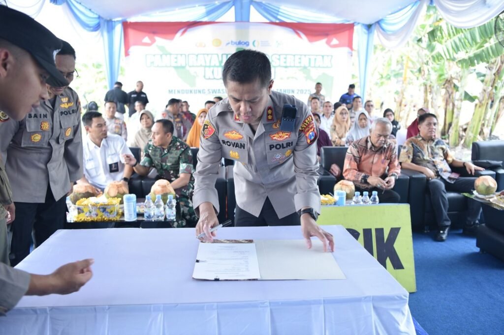 Kapolres Gresik menandatangani Berita Acara Serah Terima hasil panen dari Polres Gresik kepada Bulog
