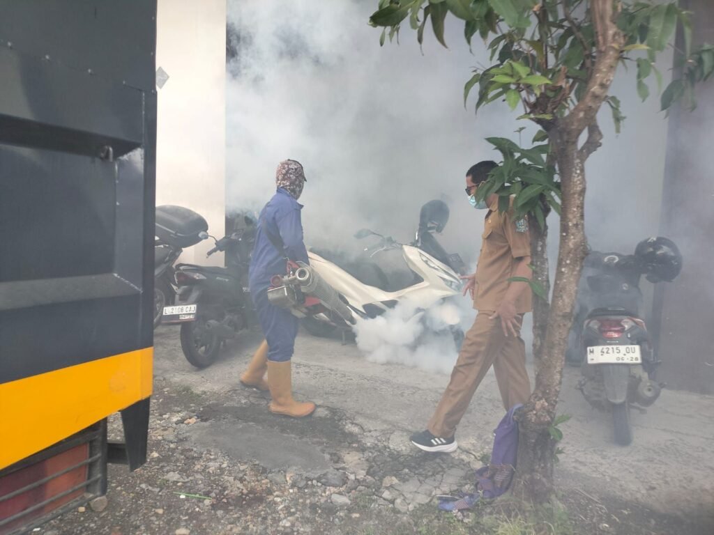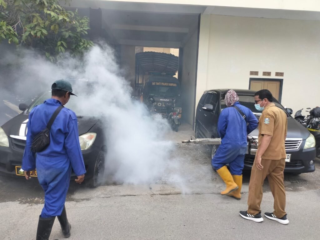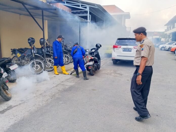 Sampang, Nusaberita.live – Sejumlah titik rawan nyamuk Demam Berdarah Dengue (DBD) di lingkungan Polres Sampang di lakukan fogging.
